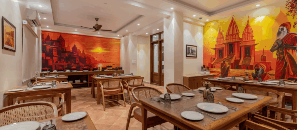Rooms and suites are comfortably minimalist, with neutral palettes, locally crafted décor, and amenities designed to support both rest and reflection. The restaurant serves vegetarian fare influenced by Banarasi traditions, with modern presentation and excellent attention to detail.