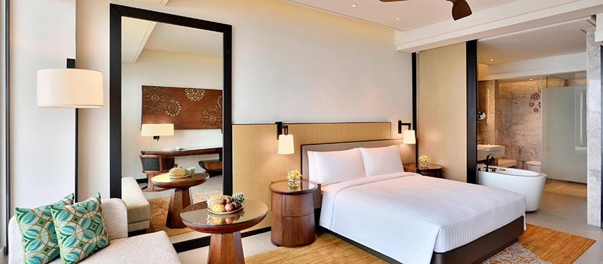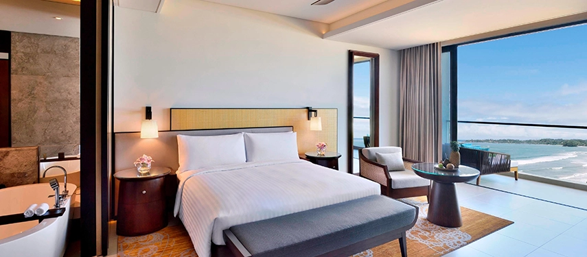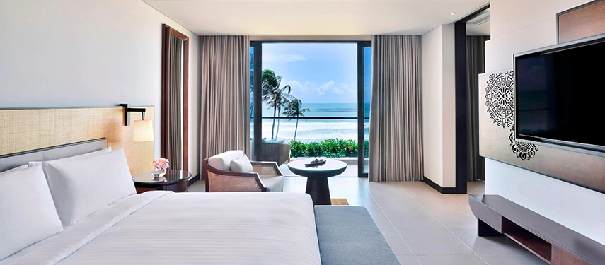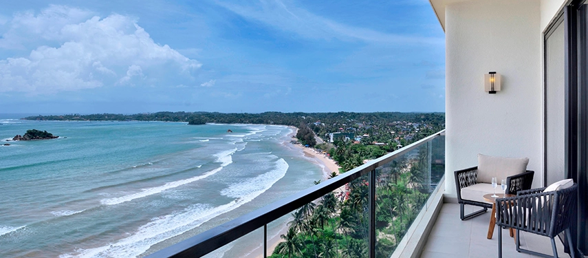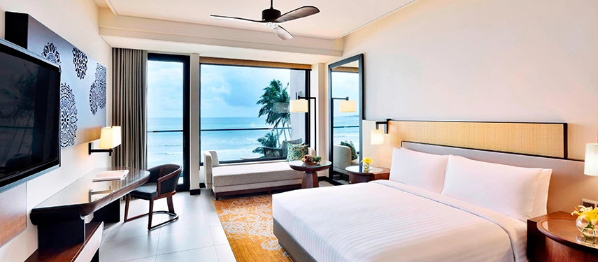 Weligama Bay Marriott Resort & Spa sits right on the sand of Weligama Bay, one of the most sheltered stretches of Sri Lanka’s southern coastline and one of the best surf beaches in the country. The bay’s naturally calm curve makes it ideal for swimming and beginner-friendly surfing, creating an easy, accessible beachfront base after days spent travelling through Sri Lanka’s cultural heartland. As a modern beachfront resort, the Marriott offers large, light-filled rooms with private balconies, polished facilities and wide ocean views that begin the moment you enter the lobby.