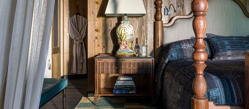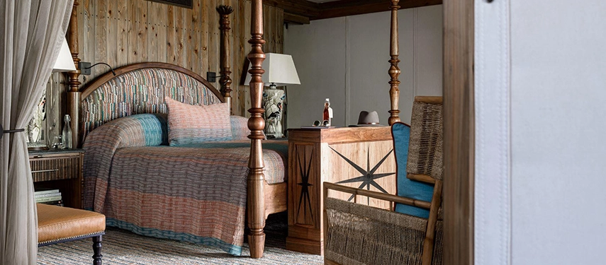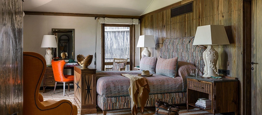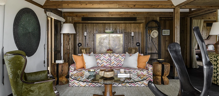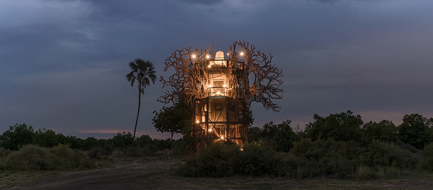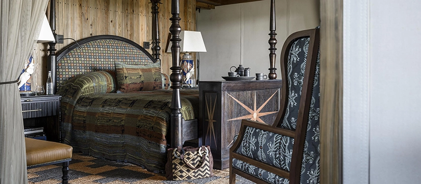 What immediately distinguishes Xigera from any other camp in Africa is its commitment to art on a breathtaking scale. Home to the continent’s largest private contemporary art collection in hospitality, the lodge was conceived in collaboration with 80 of Africa’s most acclaimed designers. Hand-carved furniture by Adam Birch, woven nest seats by Porky Hefer and a copper fireplace cast in the shape of an Okavango lily define the communal spaces, while a blacksmith-forged fire pit sculpture by Conrad Hicks commands the boma.