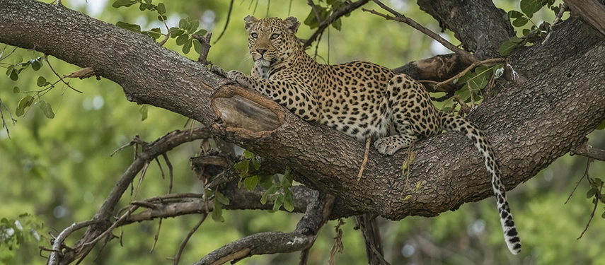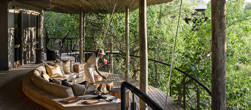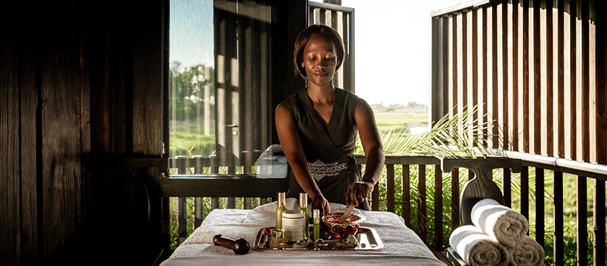 Individually designed suites sit suspended on stilts beneath ancient jackalberry, mangosteen and leadwood trees, connected by raised wooden walkways and gazing out over the floodplains beyond. Each takes its design inspiration from the flight of Pel’s fishing owl, its interiors layering timber, bronze and handcrafted textiles across generous spaces with a private deck and gazebo, freestanding bathtub and both indoor and outdoor showers. A dedicated two-bedroom Family Suite connects two ensuite bedrooms via a shared lounge.