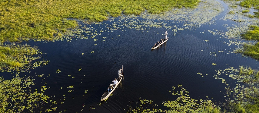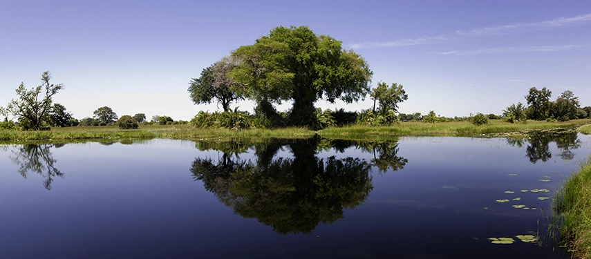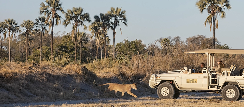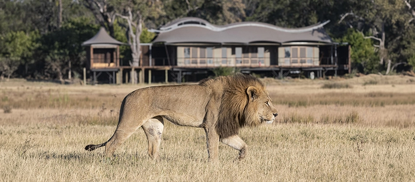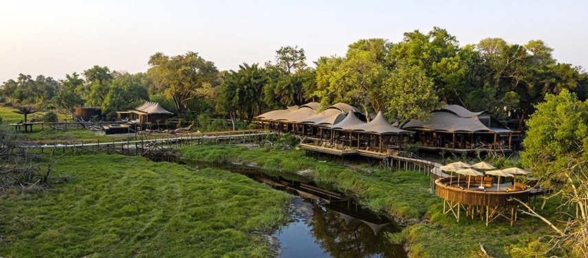 Xigera — pronounced ‘kee-jera’ and named for the pied kingfisher that nests among its waterways — occupies a private concession within Botswana’s Moremi Game Reserve, where the Okavango Delta unfolds across seasonal floodplains, papyrus channels and ancient riverine forest. Guests arrive via an elevated bridge over a papyrus-lined waterway — a quietly theatrical introduction to the only camp on its concession, set within a UNESCO World Heritage Site.