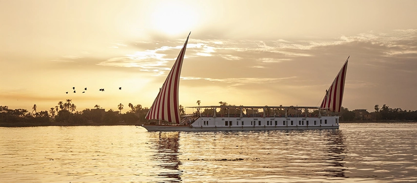 By afternoon you begin to feel the slower rhythm of dahabiya travel, where the pleasure lies in simply watching the scenery shift between green fields, sandstone outcrops and villages perched close to the water. A freshly prepared lunch is served on deck, and the day closes with the first of many golden sunsets reflected across the river’s calm surface.